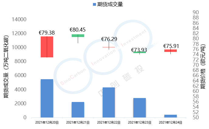 2021年12月20日至12月24日,尽管俄罗斯停供了“亚马尔-欧洲”的天然气管道,在一定程度上造就了欧洲高昂的天然气价格,但由于近期美国液化天然气的强劲供给,本周三欧洲天然气市场出现暴跌,由于天然气市场和碳市场的连锁效应,本周欧盟碳市场总体呈现下跌趋势。本周欧盟碳价由79.38欧元/吨下跌至75.91欧元/吨,跌幅为4.4%;英国碳价由90.90欧元/吨下跌至88.83欧元/吨,跌幅为2.3%。本周欧盟碳市场期货成交量达到1.52亿吨,欧盟配额拍卖量为254万吨,英国碳市场本周期货成交量为537万吨。