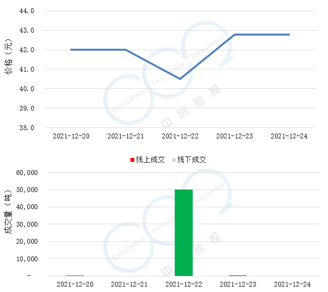 - 上海碳市场本周碳价波动较大,周三碳价下跌至40.50元后小幅上涨,最终较上周相比上涨0.7%,自42.45元上涨至42.77元。