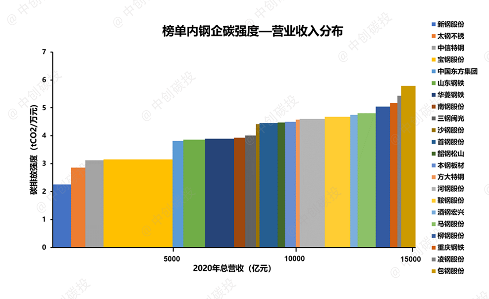 从分布图可以看出,榜单内上市钢铁公司(除宝钢股份之外)随着营收规模的增加,碳排放也随之增加,而随着营收规模的扩大,企业平均碳强度有所下降。