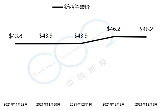 2021年11月29日至12月3日,新西兰碳价由43.8美元/吨上涨至46.2美元/吨。