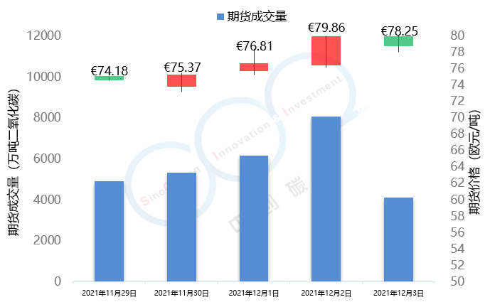 2021年11月29日至12月3日,由于俄罗斯北溪2天然气供给项目难产导致欧洲天然气需求无法得到满足,寒冬到来更加剧了此轮欧洲“气荒”。随着天然气价格上涨的还有欧洲电价,这扩大了煤电发电端利润空间,煤电发电量的增长将欧盟碳价逐步推向80欧元/吨。本周欧盟碳价由74.18欧元/吨上涨至78.25欧元/吨,涨幅为5.5%;英国碳价由81.68欧元/吨小幅下跌至80.80欧元/吨。本周欧盟碳市场期货成交量为2.85亿吨,欧盟配额拍卖量为1142万吨,英国碳市场本周拍卖成交量为1503万吨。