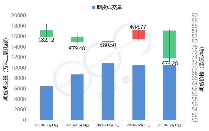 2021年12月13日至12月17日,本周欧盟碳市场总体呈现下跌趋势,由于受到欧盟可能干预碳价消息的影响,市场恐慌情绪高涨,本周五单日下跌13.6%,形成欧盟碳市场有史以来最大单日跌幅。本周欧盟碳价由82.12欧元/吨下跌至73.28欧元/吨,跌幅为10.8%;英国碳价由86.26欧元/吨上涨至89.45欧元/吨,涨幅为3.7%。本周欧盟碳市场期货成交量达到4.71亿吨,欧盟配额拍卖量为1143万吨,英国碳市场本周期货成交量为1975万吨。